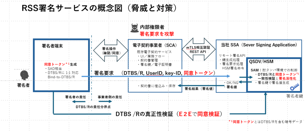 • RSSP側では、耐タンパ性デバイス(QSDV/HSM)内でトークン検証を強制し、検証に通らない限り署名は実行されません。